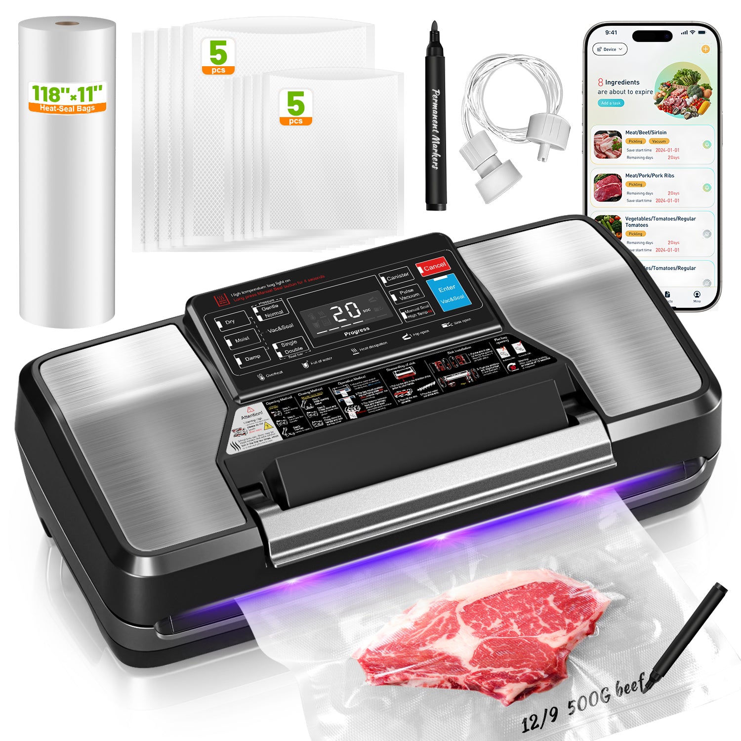 95Kpa Vacuum Sealer Machine for Food, 10-in-1 Food Saver Vacuum Sealer with Double Heat Seal, Built-in Cutter,Accessory Hose, Bag Storage, Easy-Lock Handle, App Control, 10 Bags, 1 Bag Roll & Marker for Free