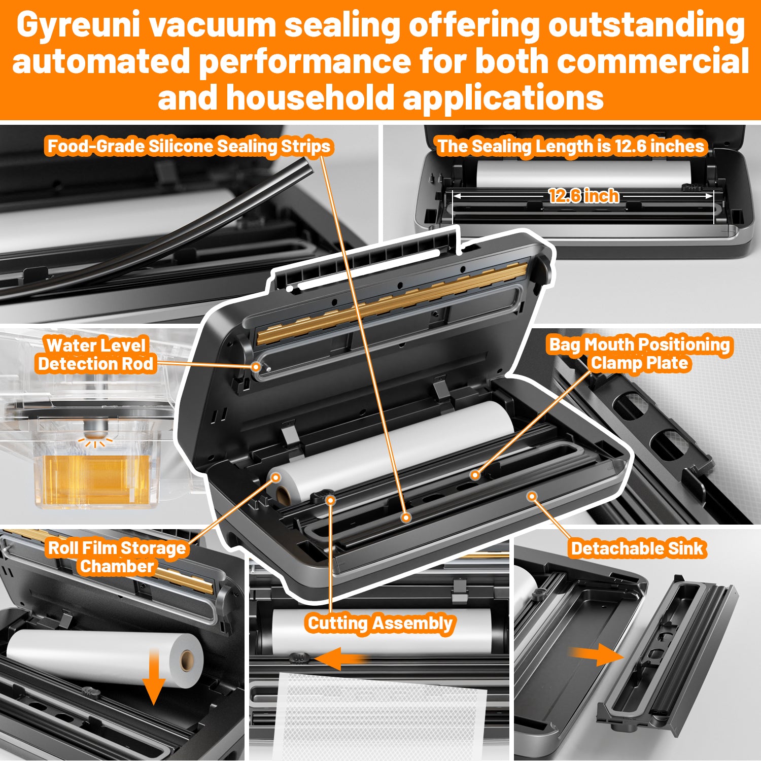 Double Seal Strength & Temperature Modes: Designed with dual sealing options and adjustable high/low temperature settings, Gyreuni food saver vacuum sealer machine ensures airtight results with different bag thicknesses.a top vacuum sealer for food storage, extending freshness,Built-in Cutter, Bag Roll Storage & Easy-Lock Handle – Features a built-in bag cutter, roll storage compartment, and ergonomic one-hand locking handle for convenient use. Comes with 10 pre-cut bags, 1 bag roll, and a marker—everything you need to start sealing meals right away.